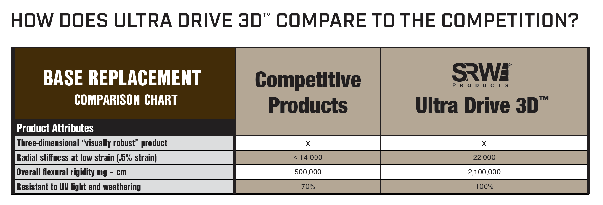 SRW Products Ultra Drive 3D™ allows you to save up to 50% on base excavation in poor base soil during hardscape projects. Our paver base replacement is the strongest three-dimensional driveway grid available, making it ideal for use with paver, asphalt, and concrete driveways.