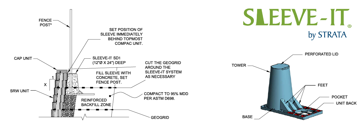 Sleeve-It® is the only patented fence-post anchoring system that integrates stable fence footings into the below grade support structure of a segmental retaining wall. Code compliant, and compatible with most fences, Sleeve-It® is easy to install so you can maximize space during all your hardscape projects.