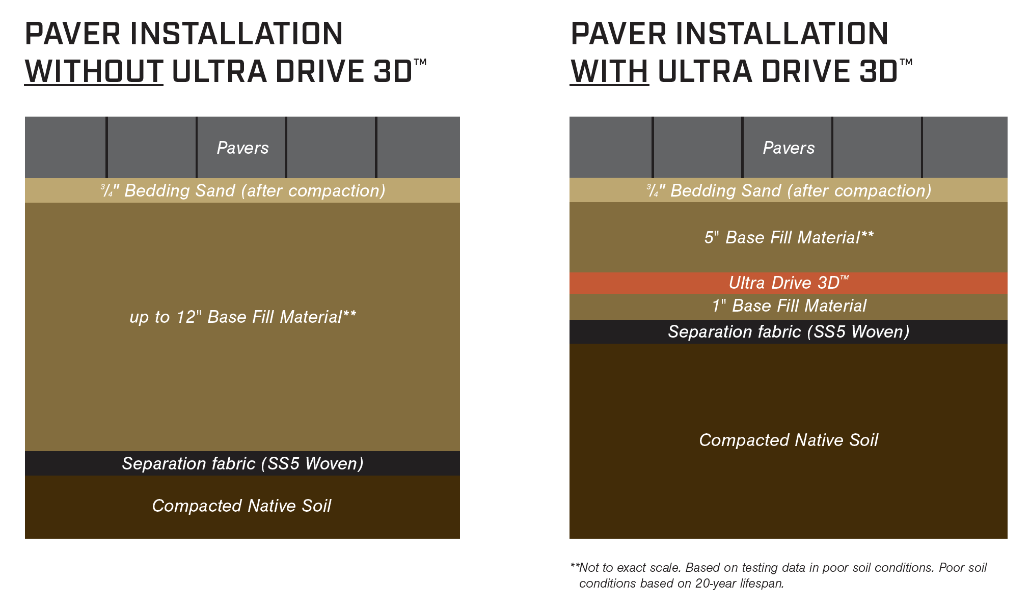 SRW Products Ultra Drive 3D™ allows you to save up to 50% on base excavation in poor base soil during hardscape projects. Our paver base replacement is the strongest three-dimensional driveway grid available, making it ideal for use with paver, asphalt, and concrete driveways.